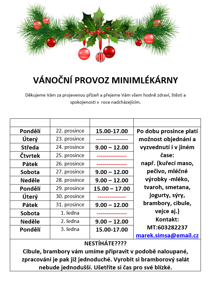 Po dobu vyorávání a třídění brambor bude výrazně omezen provoz prodejny do 6.10.2025. Otevřeno bude pouze ve středu od 14.30-17.00 hod., v sobou a neděli od 9.00-12.00 hod. V mimo prodejní dobu je možné si potraviny objednat a vyzvednout po dohodě v náhradním časovém termínu. Kontakt: 603 282 237 - p.Šimša